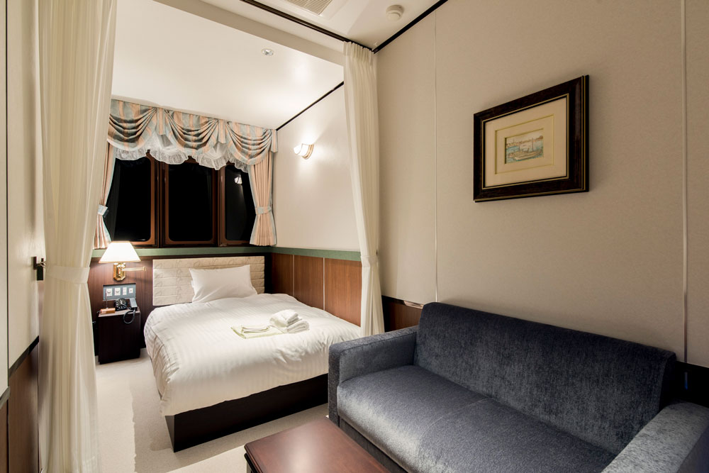 寝台列車「トワイライトエクスプレス」の内装を再現したコンセプトルーム『トワイライト シングル』(定員1名)¥16,000(税込)